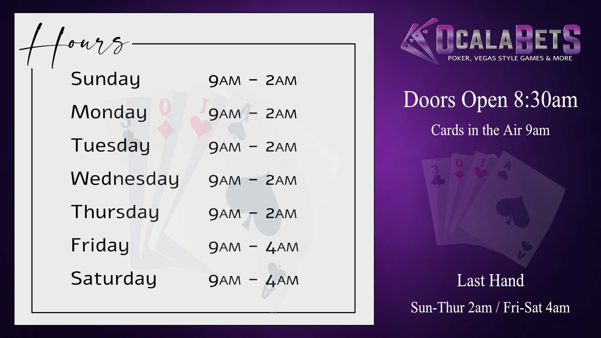 OcalaBetS Hours of Operation: Sunday 9AM-2AM - Monday 9AM-2AM - Tuesday 9AM-2AM - Wednesday 9AM-2AM - Thursday 9AM-2AM - Friday 9AM-4AM - Saturday 9AM-4AM